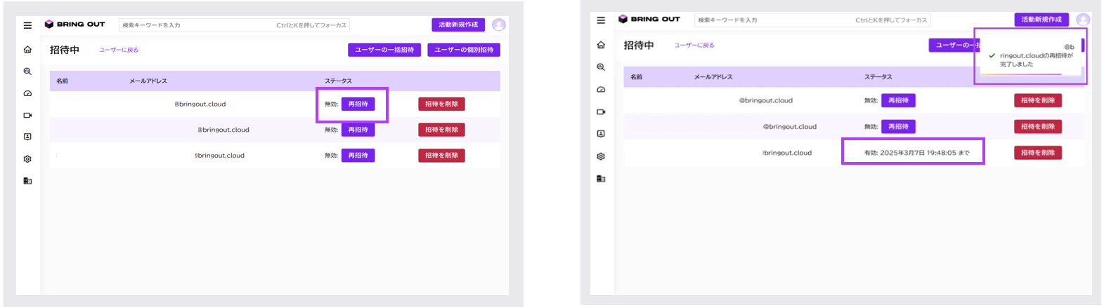 対象ユーザーの横に表示されている「再招待」ボタンをクリックします。初回の招待時と同じ内容のメールが再送されます。