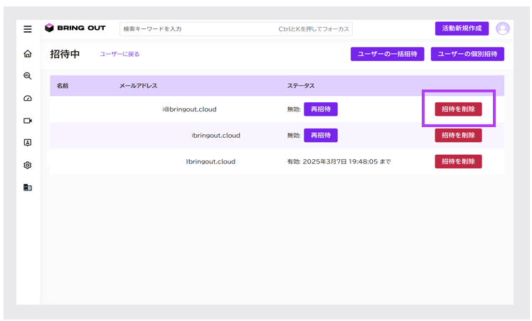 権限や氏名など、ユーザー招待時の条件を変更したい場合や、有効期間内に招待メールの再送信を行う場合には、招待を削除してください。
