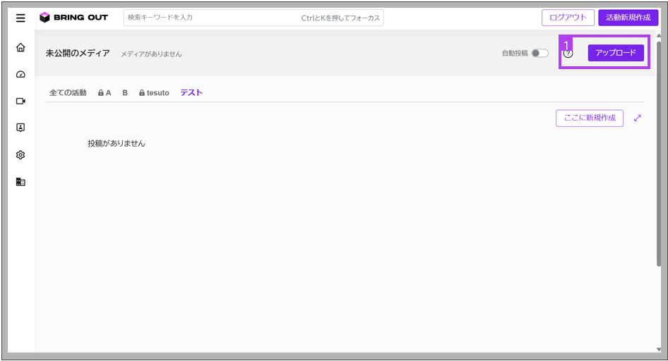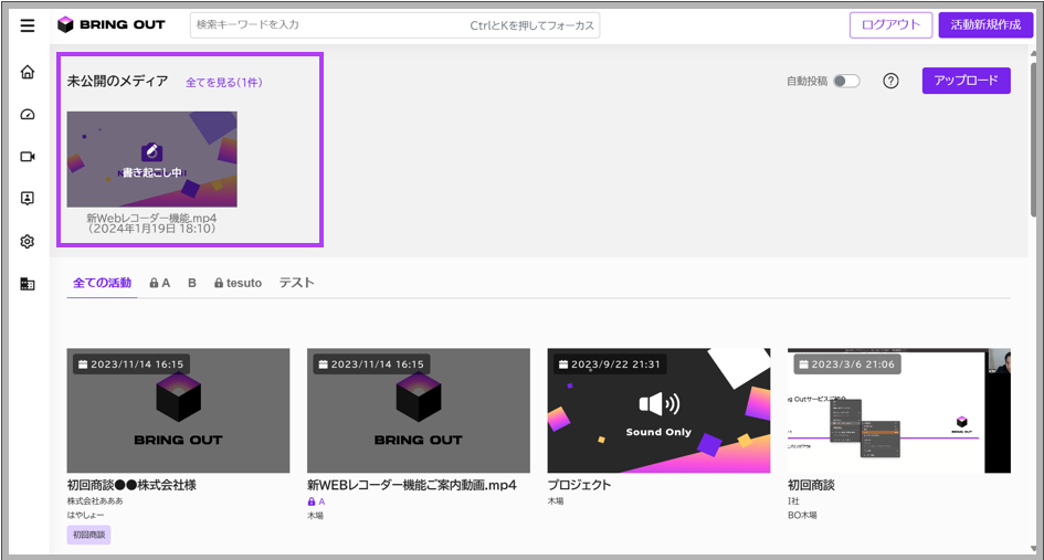正常にアップロードが完了した場合、以下のように「未公開メディア」へファイルが追加されます。