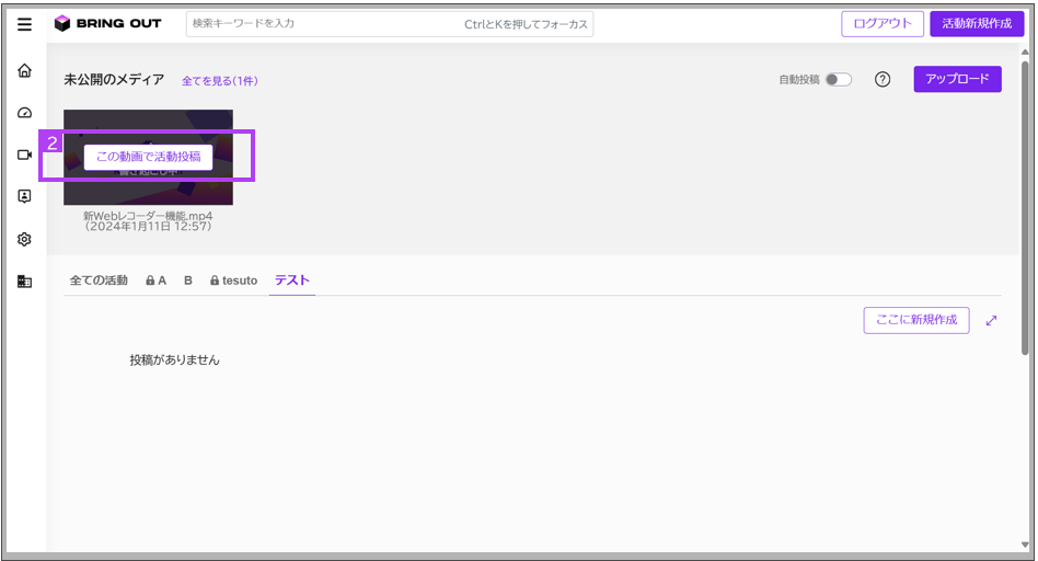 先ほど追加された動画にマウスカーソルをあわせると「この動画で活動投稿」というボタンが表示されます。