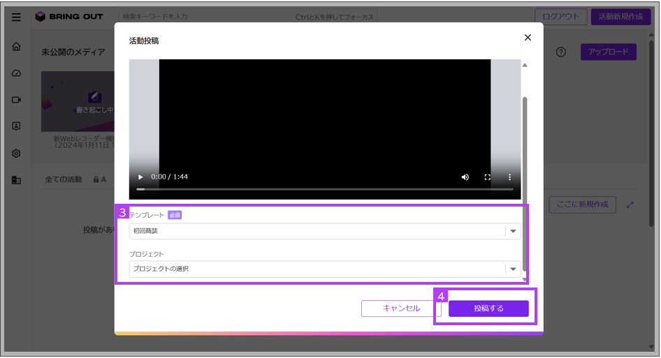 組織で指定された所定のテンプレートとプロジェクトを選び、投稿ボタンをクリックしてみましょう!