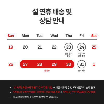 휴무 기간 : 1월 24일(금) 오후 12시 ~ 1월 31일(금) 오전 10시