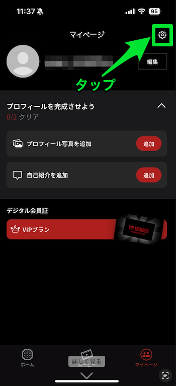 マイページ画面右上の【歯車マーク】をタップし、設定画面を開く。