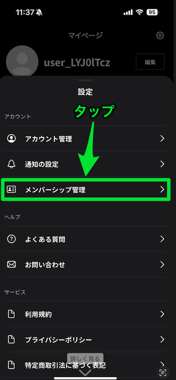 1. 設定メニューから【メンバーシップ管理】をタップ。