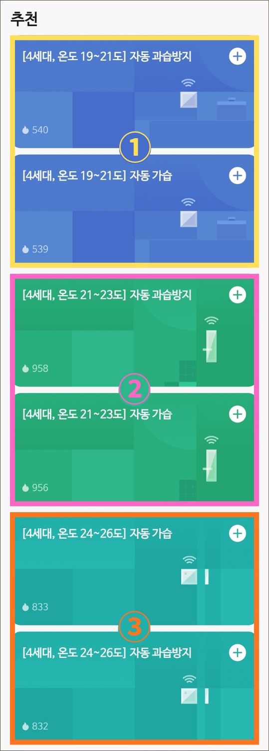 추천 시나리오에 나타나는 ‘자동 가습’ 과 ‘자동 과습 방지’ 시나리오 세트 중에 1개를 선택해
