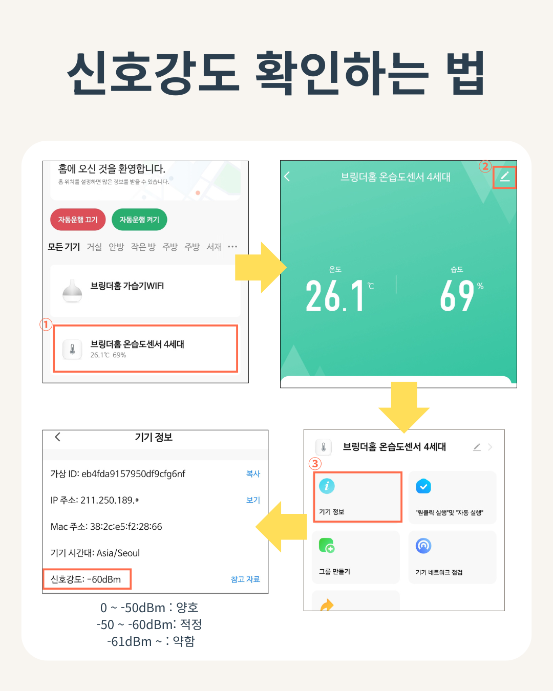 기기를 사용하시려는 현재 위치에서 신호강도가 얼마로 측정이 되고 있는지 확인해 주세요.
