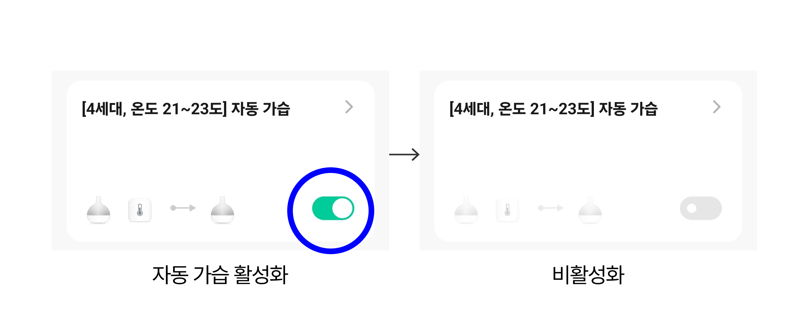 따라서, 수동 제어를 원하실 경우 시나리오 → 자동 가습을 비활성화 (회색)해두시고