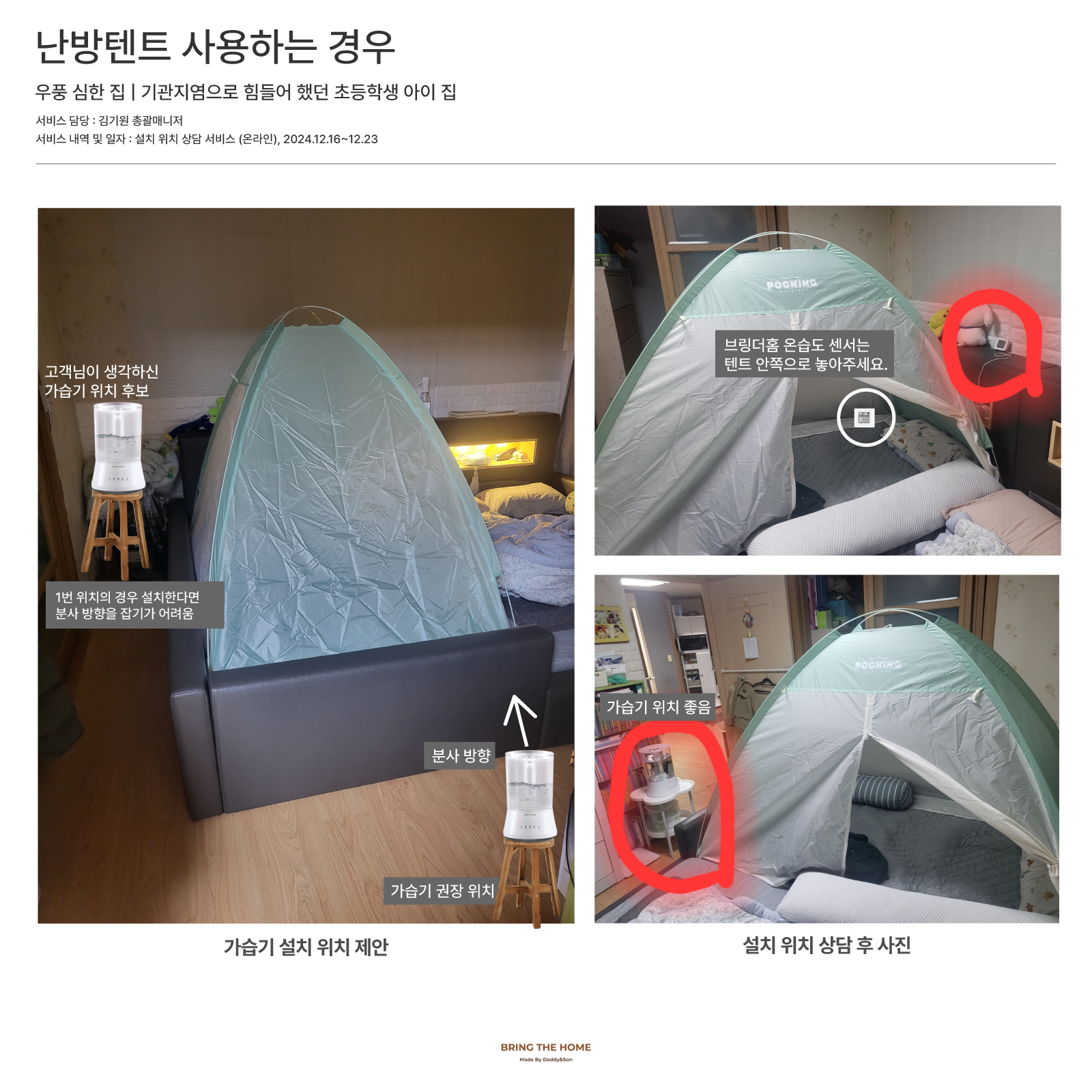 가습기 : 난방텐트 입구를 바라보는 방향과 나란히 설치하는 것이 가장 좋습니다.(아래 사례는 특수 상황이 있어 텐트 입구 방향이 90도 돌린 상황)