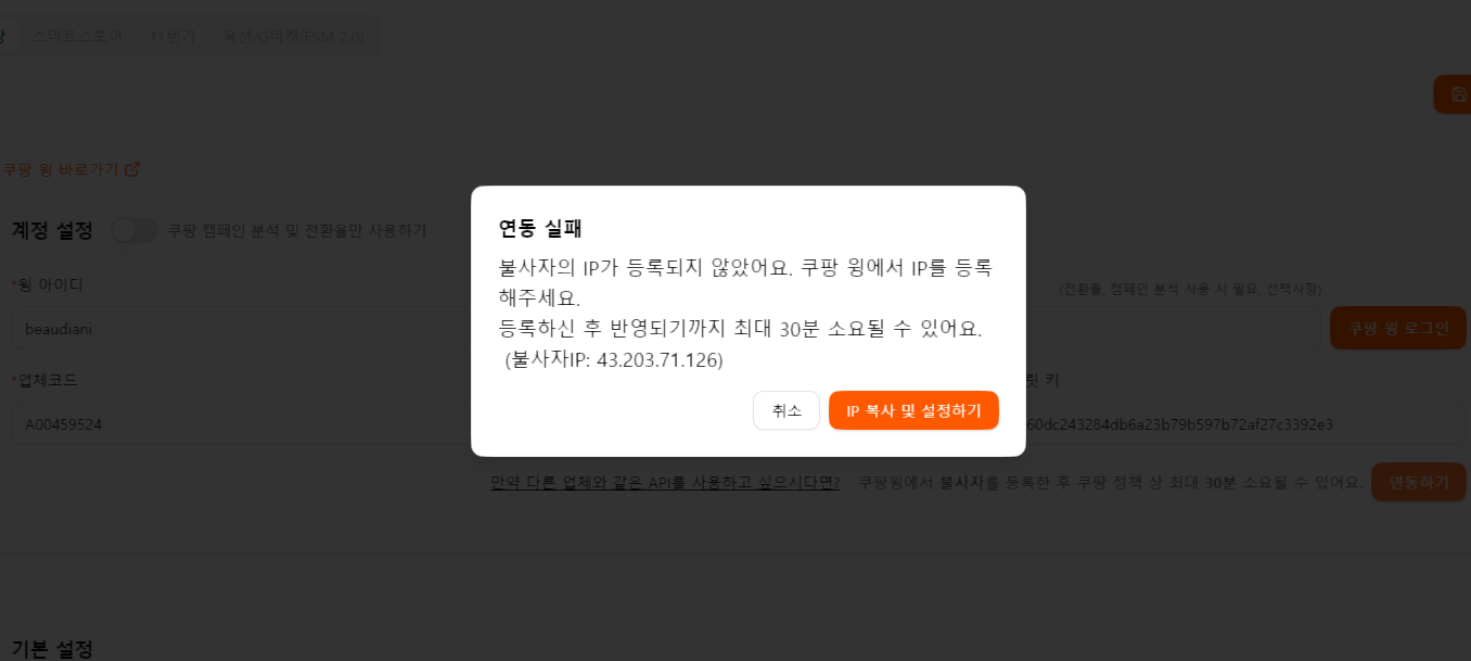 Q 12. 쿠팡윙이 연동 실패가 떠요