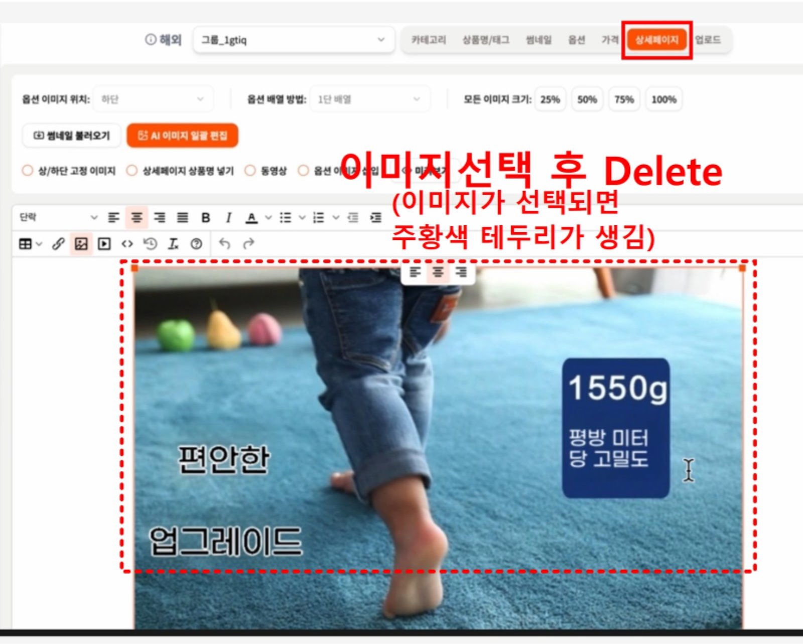 A 79. 상하단 이미지 일괄적으로 수정하시려면 업로드/마켓에서 기본 업로드 설정 - 상세페이지에서 하단 이미지 변경 후 수정 업로드 해주세요