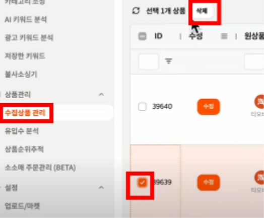 A 57. 수집상품관리에서 왼쪽상단에 삭제 버튼 누르시면 됩니다(오른쪽 이미지 참고). 삭제옵션 중 '마켓에서도 삭제하기' 하면 마켓에서도 삭제됩니다.