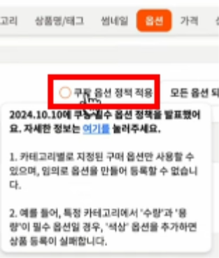 Q 18. 쿠팡 정책 옵션수정 후 재업로드시 쿠팡옵션의 일부가 판매중지로 변경되고 업로드수정이 안됩니다.