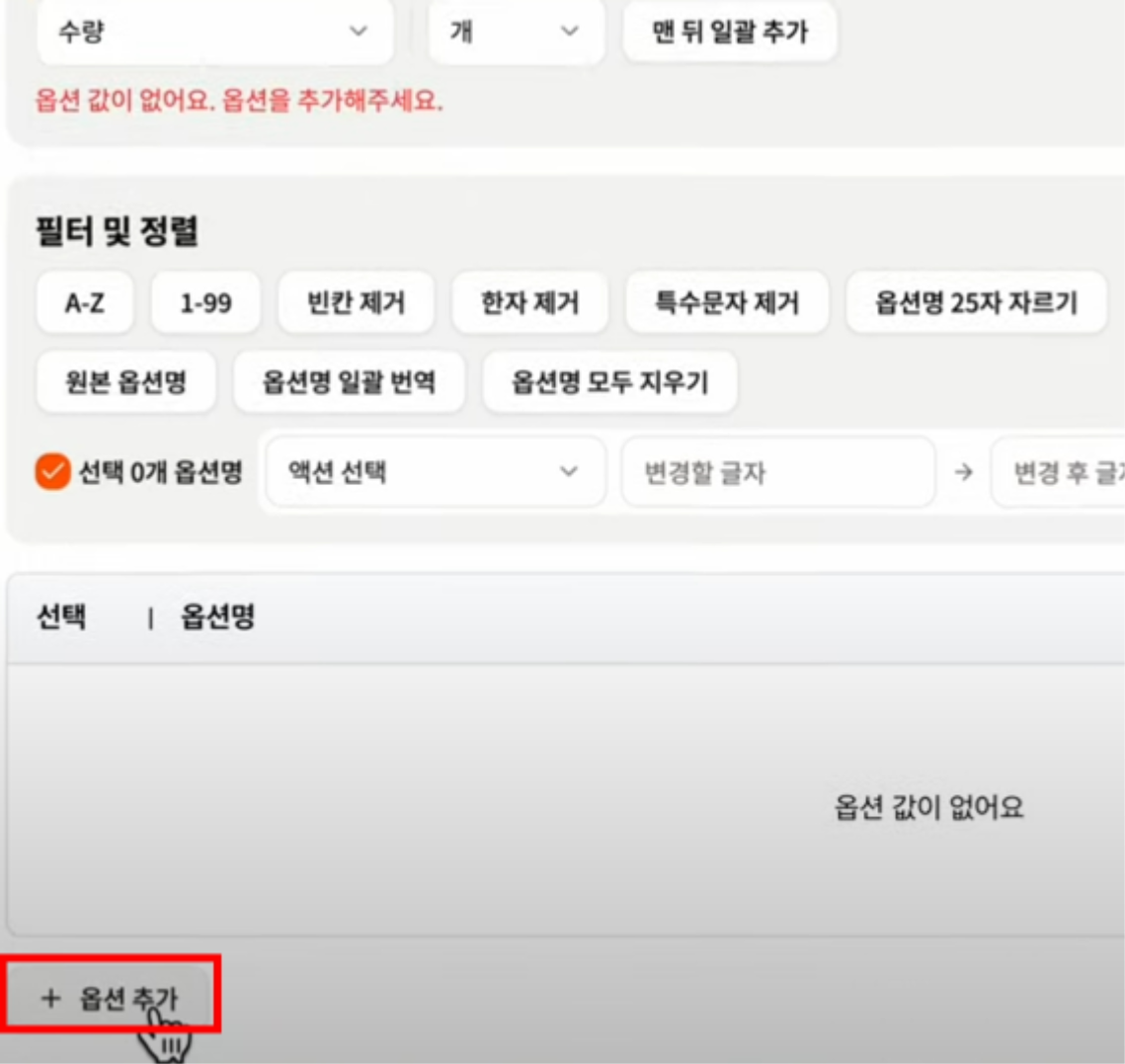 Q 71. 옵션수정 중인데, 옵션값이 없다고 옵션값을 추가해달라고 빨간색 글씨가 보입니다. 옵션 추가는 어떻게하나요?