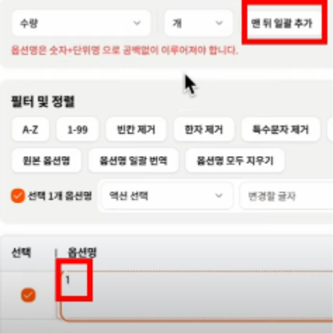 선택 단위 '개'를 선택해주신 다음 '맨 뒤 일괄 추가' 해주시면 됩니다.