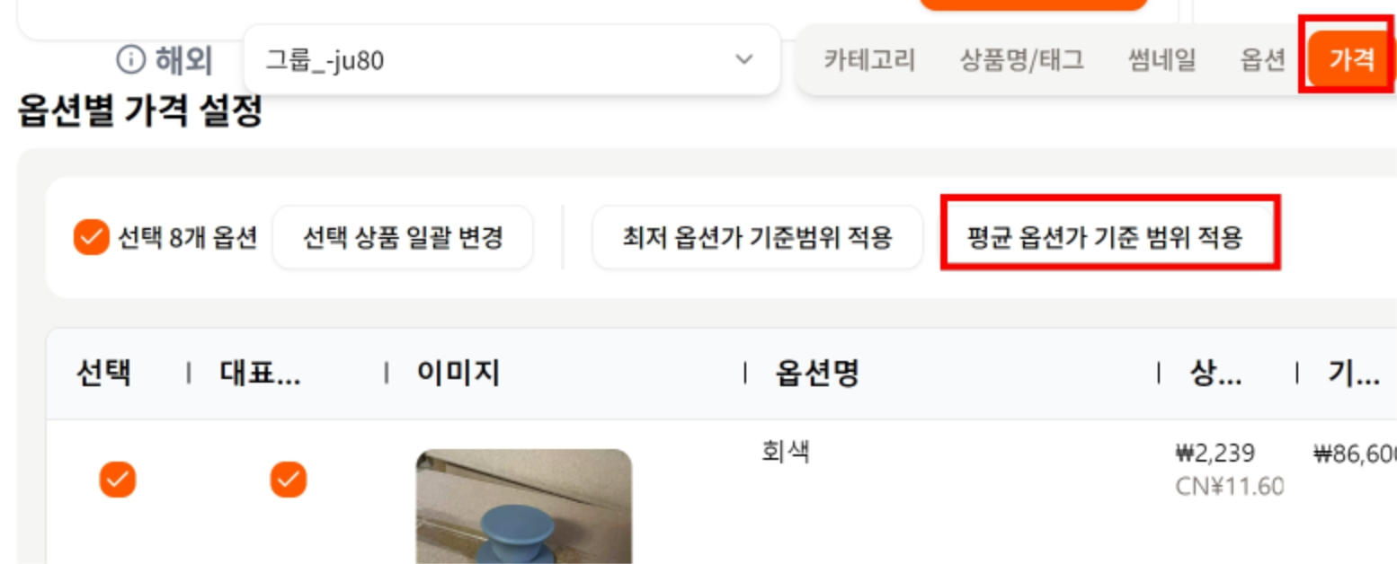 A 73. 가격탭 - 옵션별 가격설정에서 '평균 옵션가 기준 범위 적용'을 눌러주시면 됩니다.