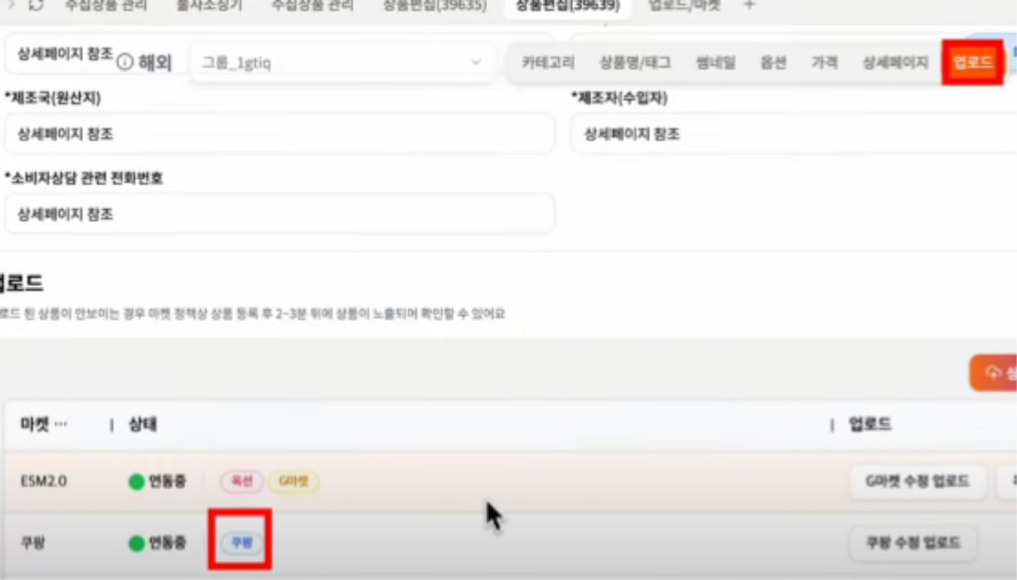 A 74. 업로드탭-'연동된 마켓 아이콘'을 클릭- 상품 옵션 선택 하면