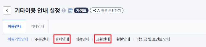 쇼핑몰 설정 > 기본 설정 > 약관 · 정보 설정 > 기타이용 안내 설정 > 이용안내 > 교환안내
