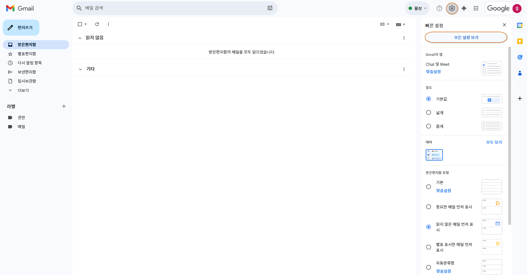 다시 Gmail ‘설정’ 화면으로 돌아와 브라우저를 새로고침합니다.