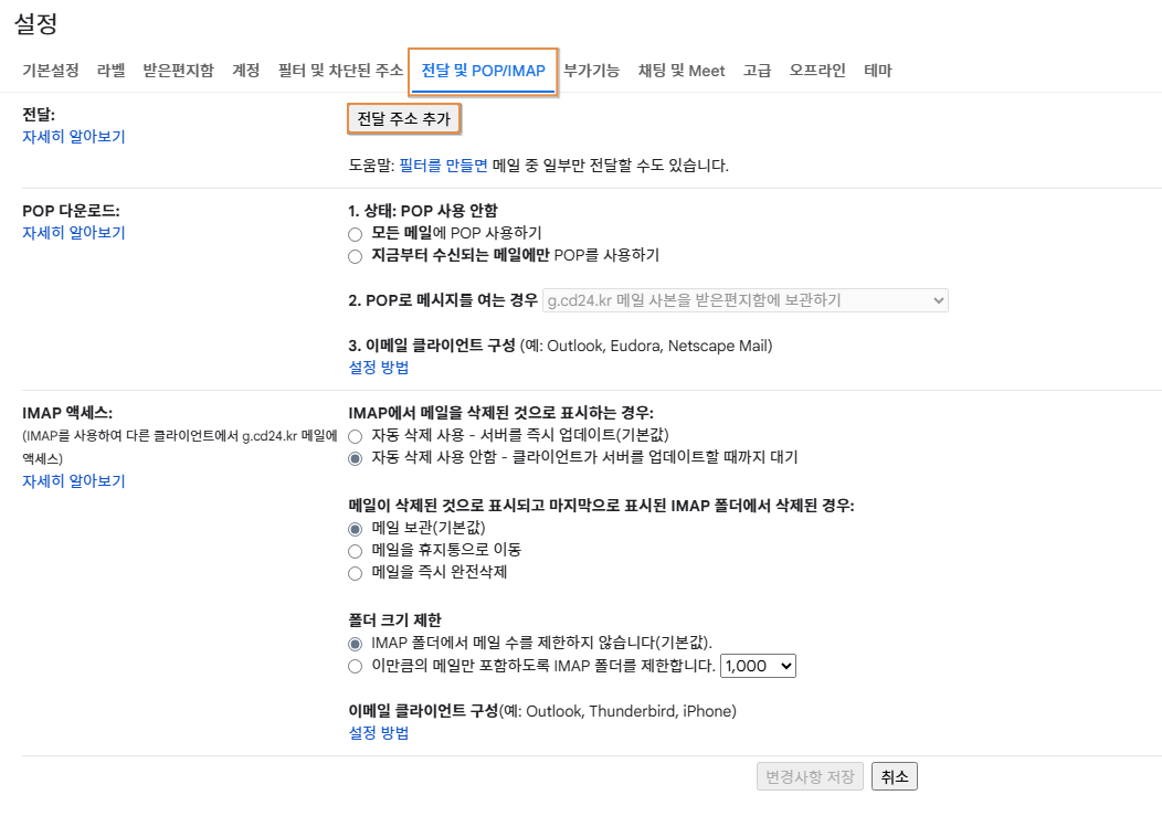 상단 탭에서 [전달 및 POP/IMAP] 메뉴를 선택하고 ‘전달 주소 추가’ 버튼을 클릭합니다.