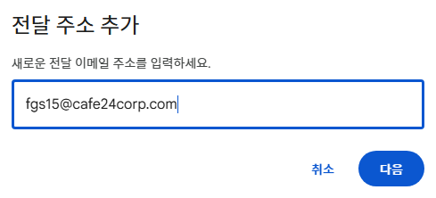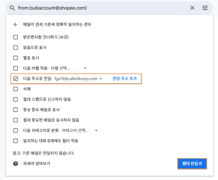 [필터 만들기] 버튼 클릭 → ‘다음 주소로 전달’ 체크 → fgs15@cafe24corp.com 를 선택합니다.