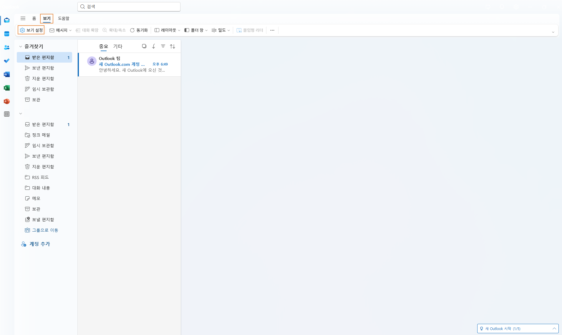 Outlook에 로그인한 뒤, 화면 좌측 상단 [보기 → 보기 설정]을 클릭합니다.