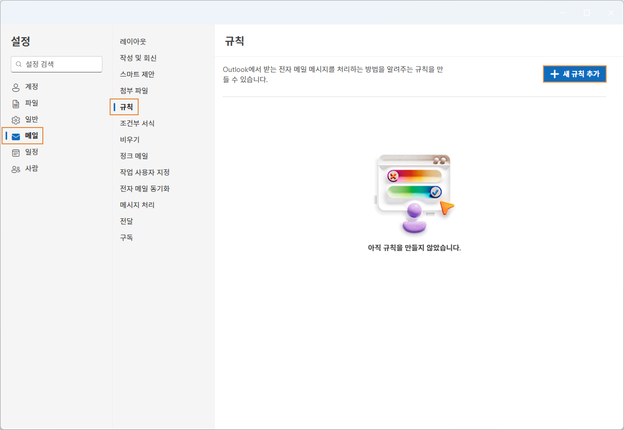 좌측 탭에서 [메일 → 규칙] 메뉴를 선택하고 ‘새 규칙 추가’ 버튼을 클릭합니다.
