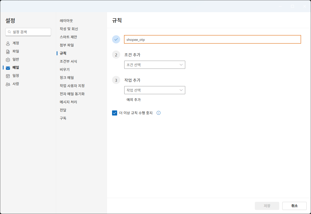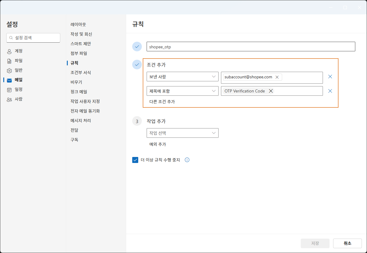 ※ 서비스 해지 후 포워딩을 해제하고 싶다면, 동일한 [규칙] 메뉴에서 shopee_otp를 삭제해주세요.
