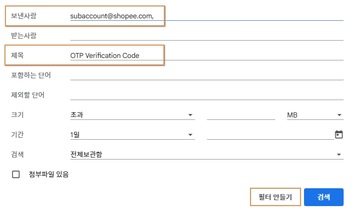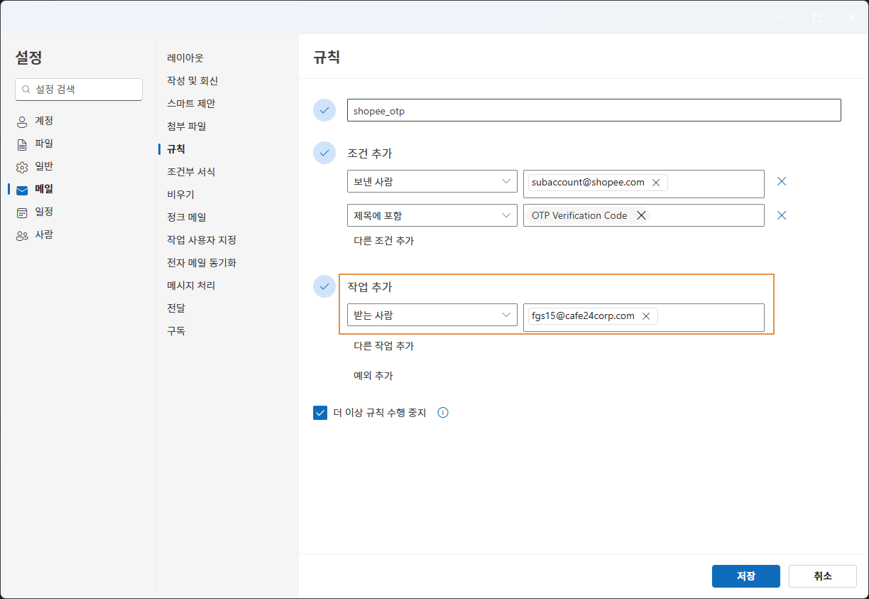 이제 쇼피 OTP 메일만 자동으로 지정된 주소로 전달됩니다.