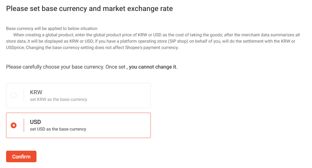 쇼피 계정의 기본 통화(Base Currency)는 가입 시 한 번만 설정 가능하며, 이후 변경이 불가합니다.