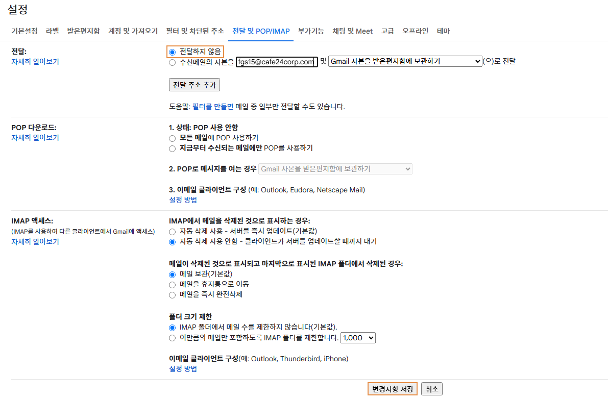 ※ 서비스 해지 후 포워딩을 해제하고 싶다면, 동일한 [전달] 섹션에서 ‘전달하지 않음’을 선택한 뒤 ‘변경사항 저장’을 클릭하세요.