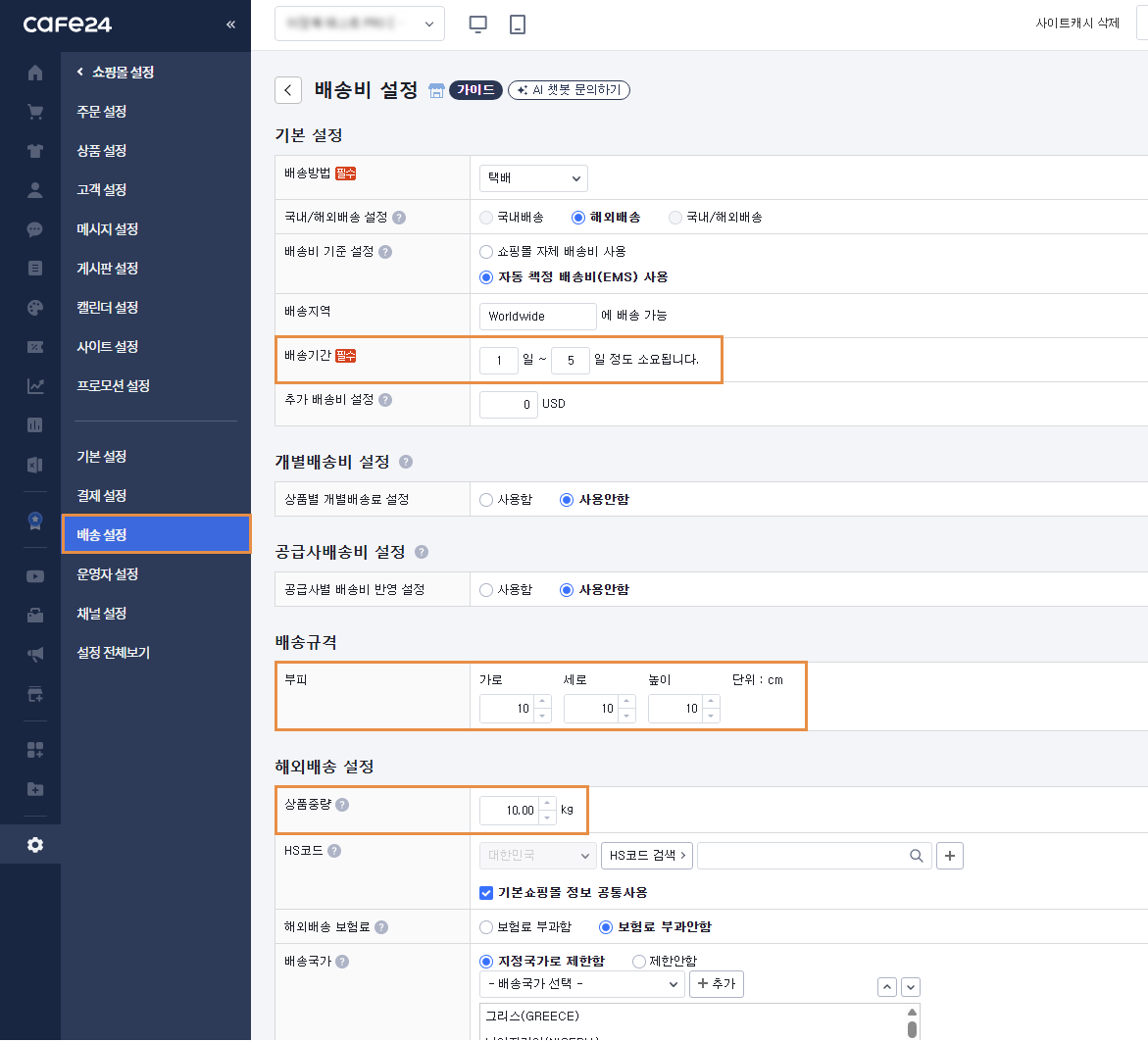 [EC 쇼핑몰 설정 > 배송 설정 > 배송비 설정]