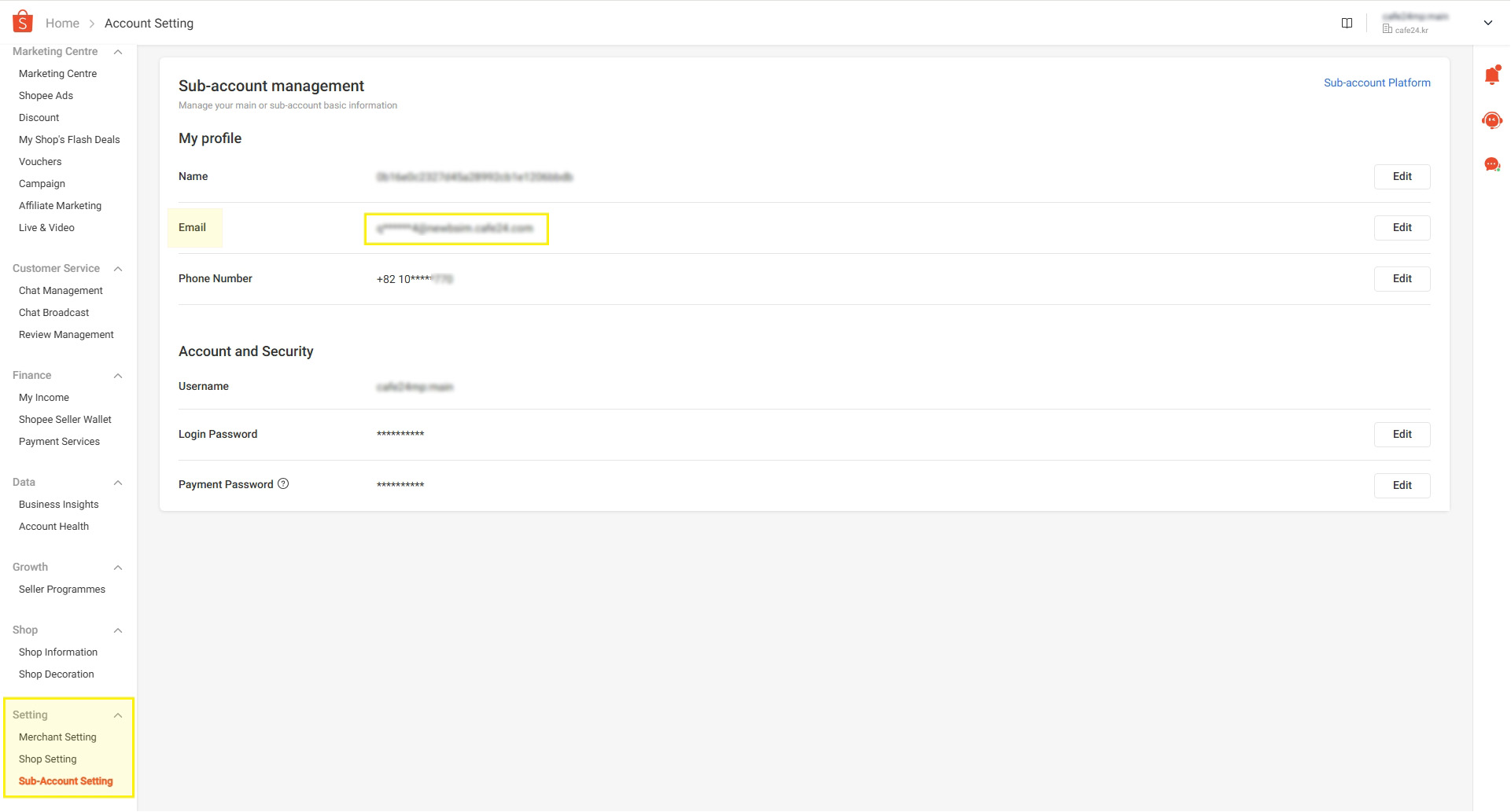 Shopee 로그인 시 발송되는 OTP 메일은 ‘Sub-Account 프로필에 등록된 이메일 주소’로 발송됩니다.