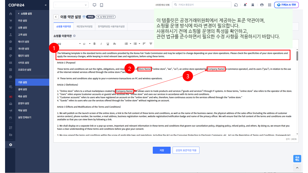 🧐 경로 : 쇼핑몰 설정 > 기본 설정 > 약관 · 정보 설정 > 이용 약관 설정 > 쇼핑몰 이용약관