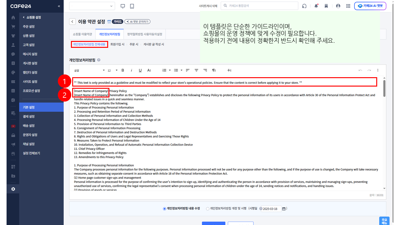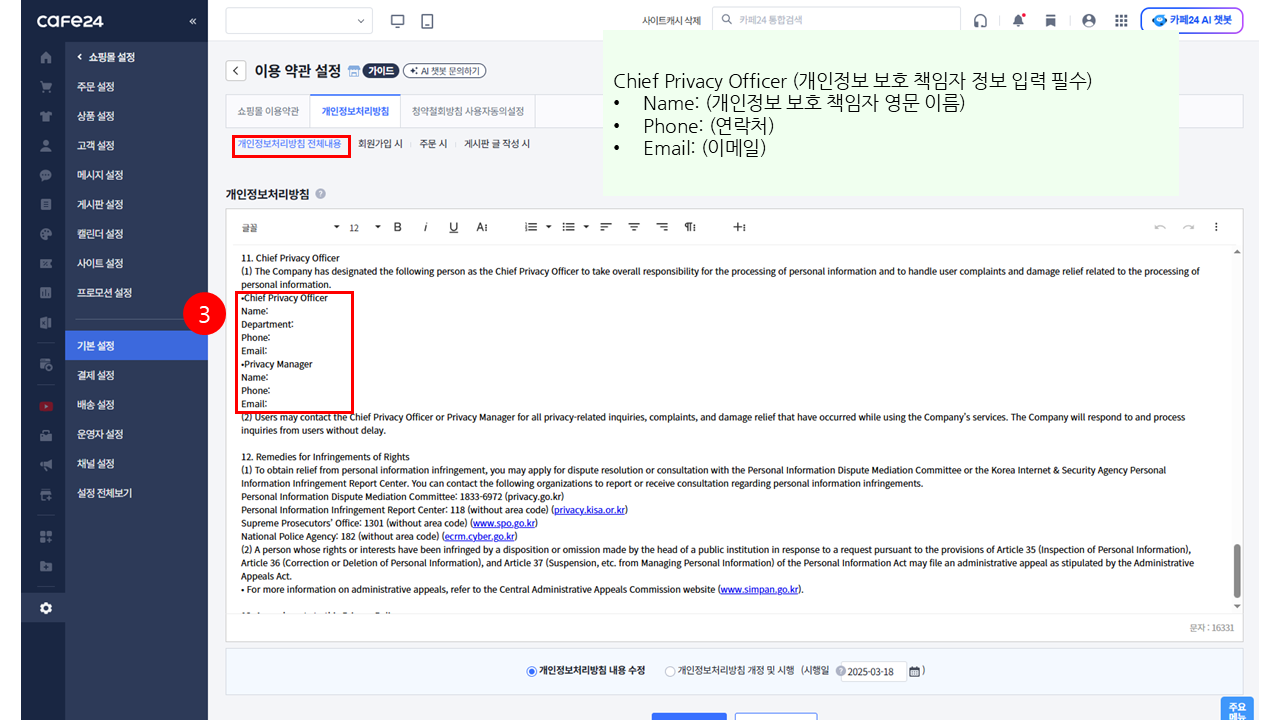 🧐 경로 : 쇼핑몰 설정 > 기본 설정 > 약관 · 정보 설정 > 이용 약관 설정 > 개인정보처리방침