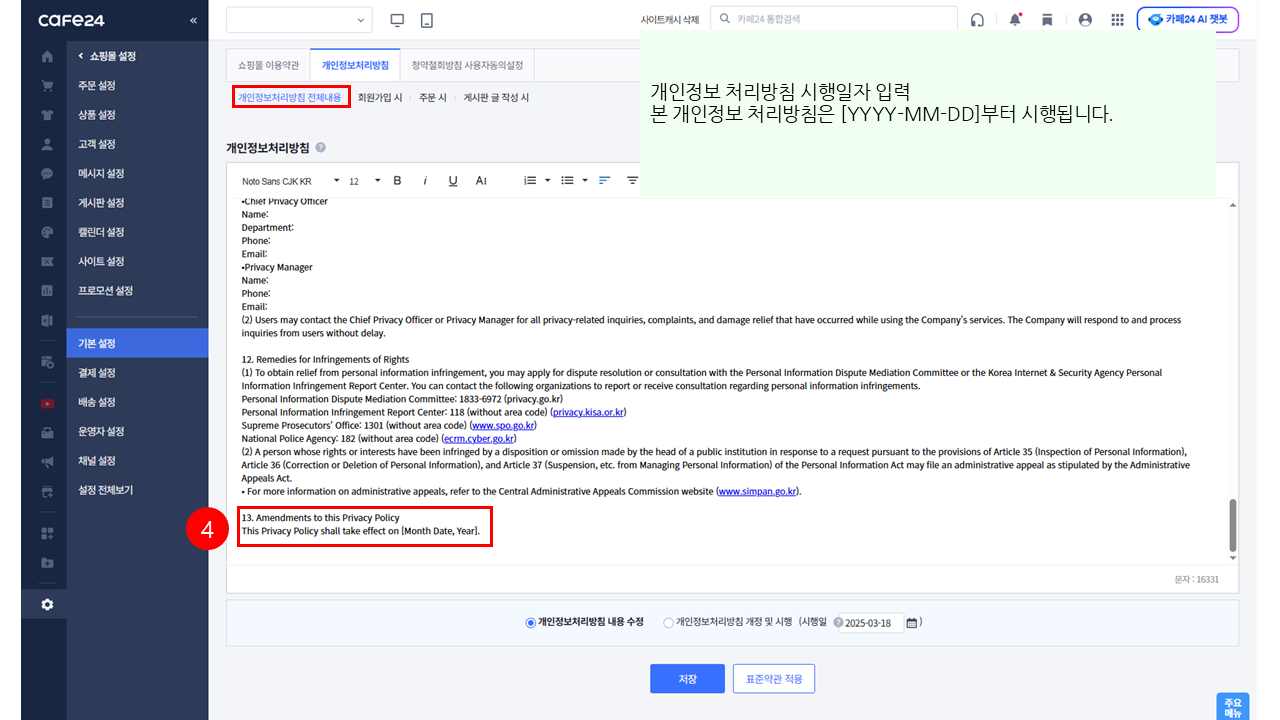 4. 개인정보 처리방침 시행일자 입력