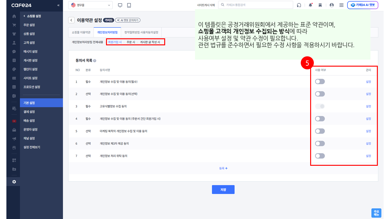 5. 개인정보 수집 이용 동의 (회원가입시, 주문시, 게시판 글 작성시) 사용 여부 설정 및 약관 수정