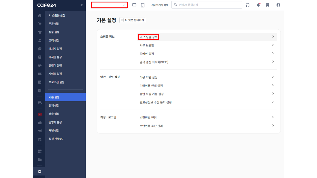 신규 생성된 영문몰, 일문몰로 접속해요. 쇼핑몰 설정 > 기본 설정 > 쇼핑몰 정보 > 내 쇼핑몰 정보로 이동해요.