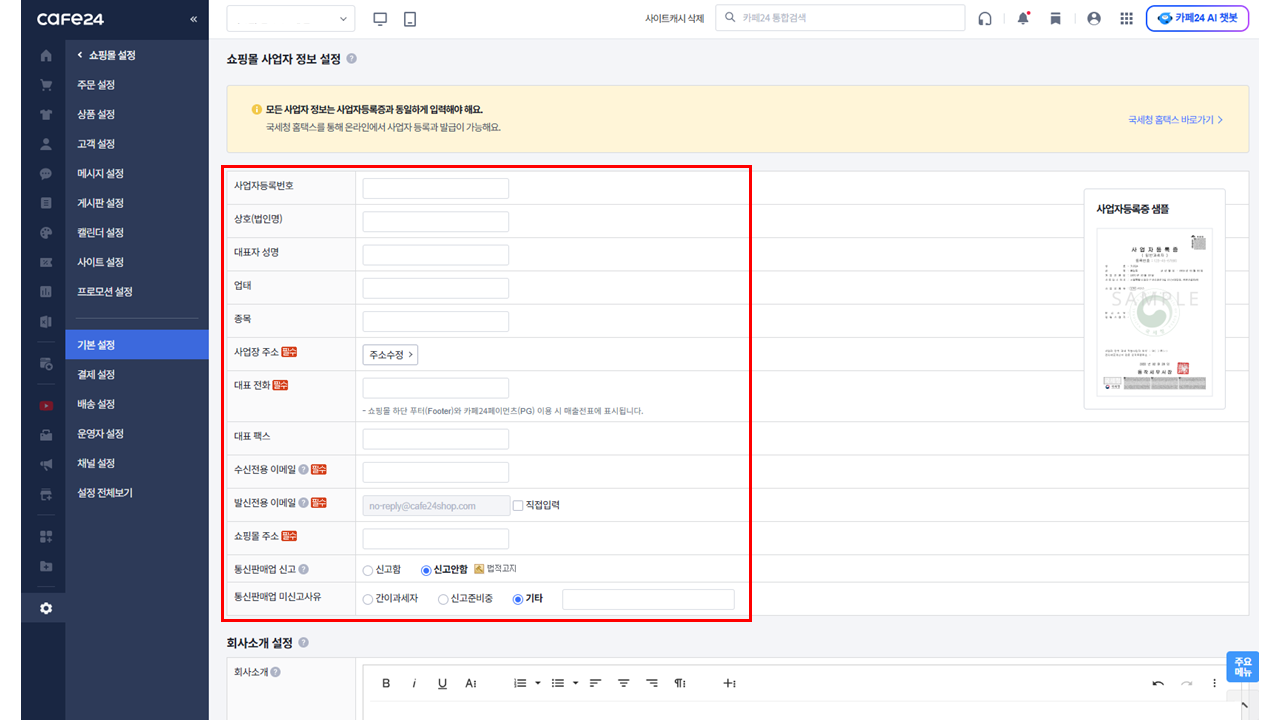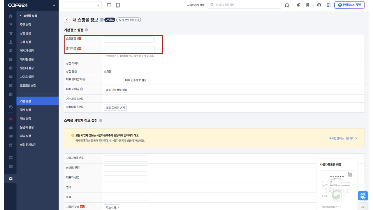 작성해주세요. 사업자정보는 쇼핑몰 하단 푸터(Footer) 영역 에 표시돼요.