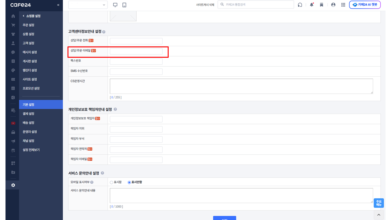해외고객에게 안내될 쇼핑몰 정보는 반드시 영문으로 설정해주세요.