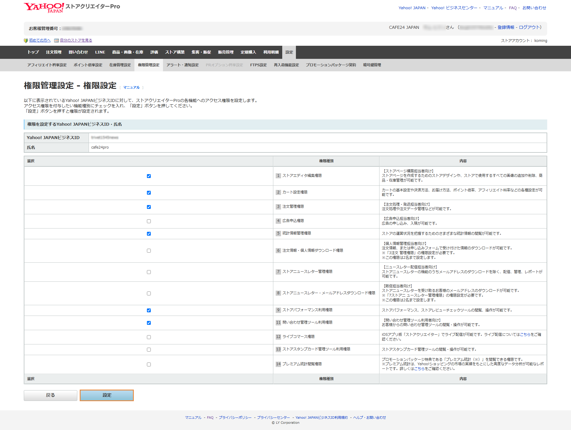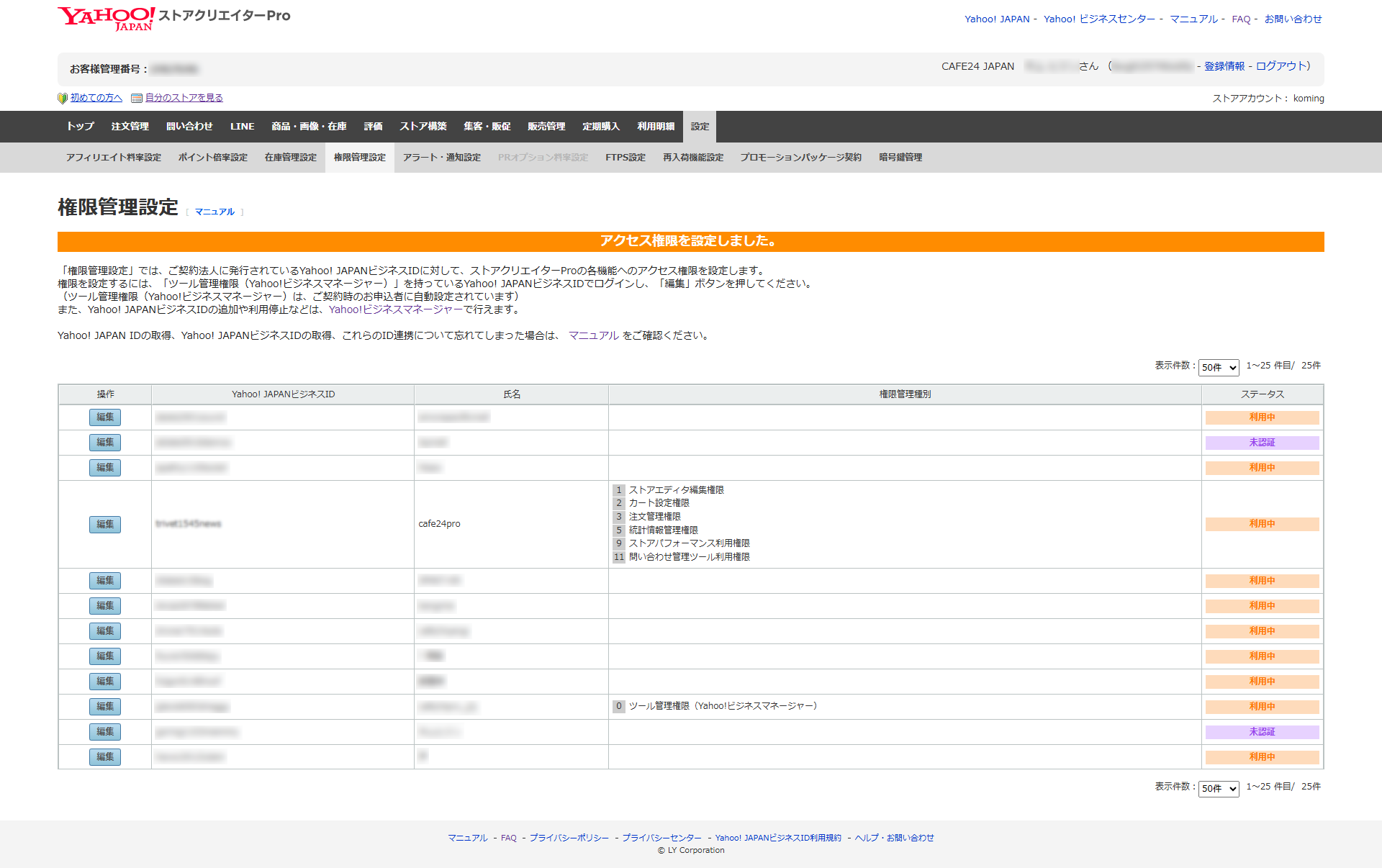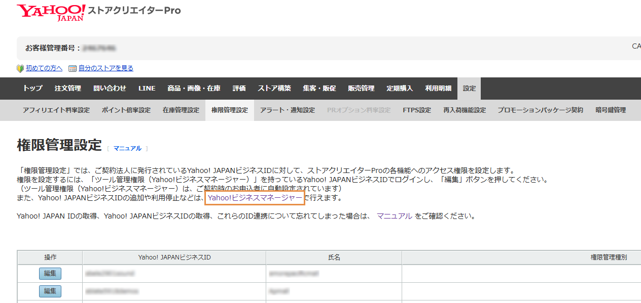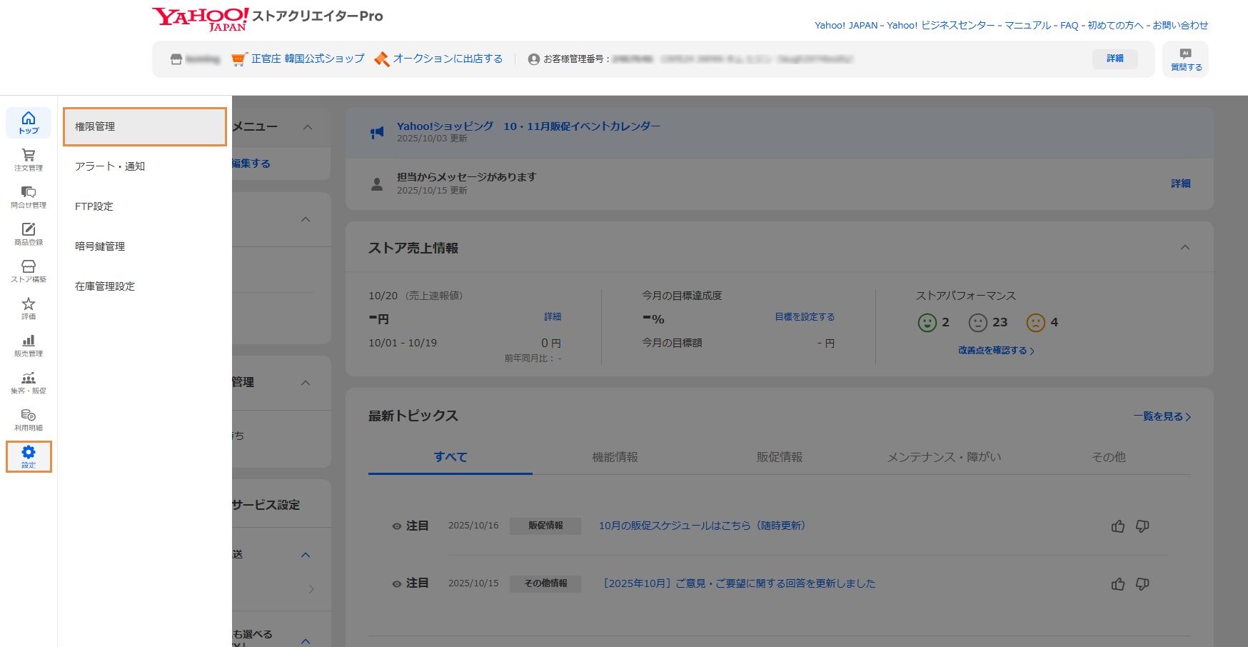 1️⃣ Yahoo Japan ストア·クリエイター Pro에 로그인한 후, [設定 > 権限管理 (설정 > 권한 관리)]를 클릭합니다.