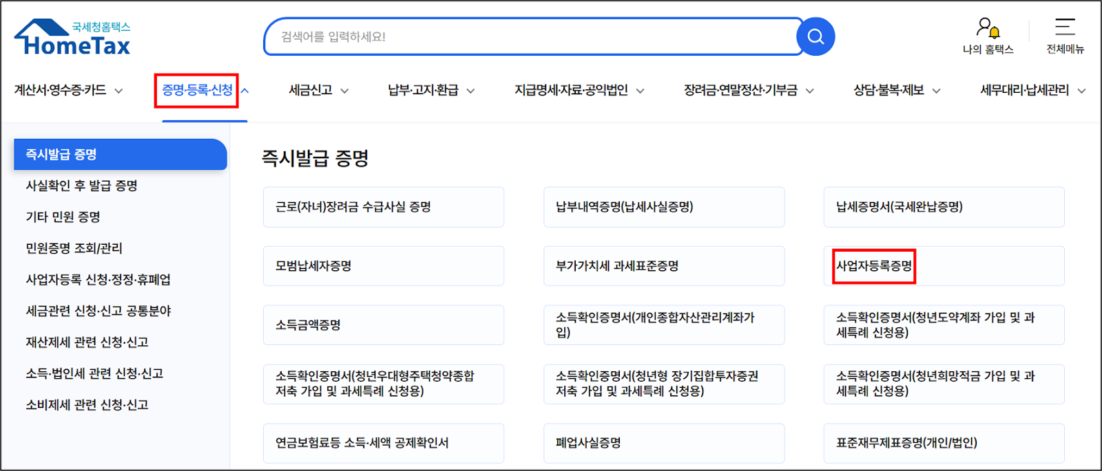 1. 홈택스 로그인 후 [증명·등록·신청] - [즉시발급증명] - [사업자등록증명] 메뉴로 들어가주세요.
