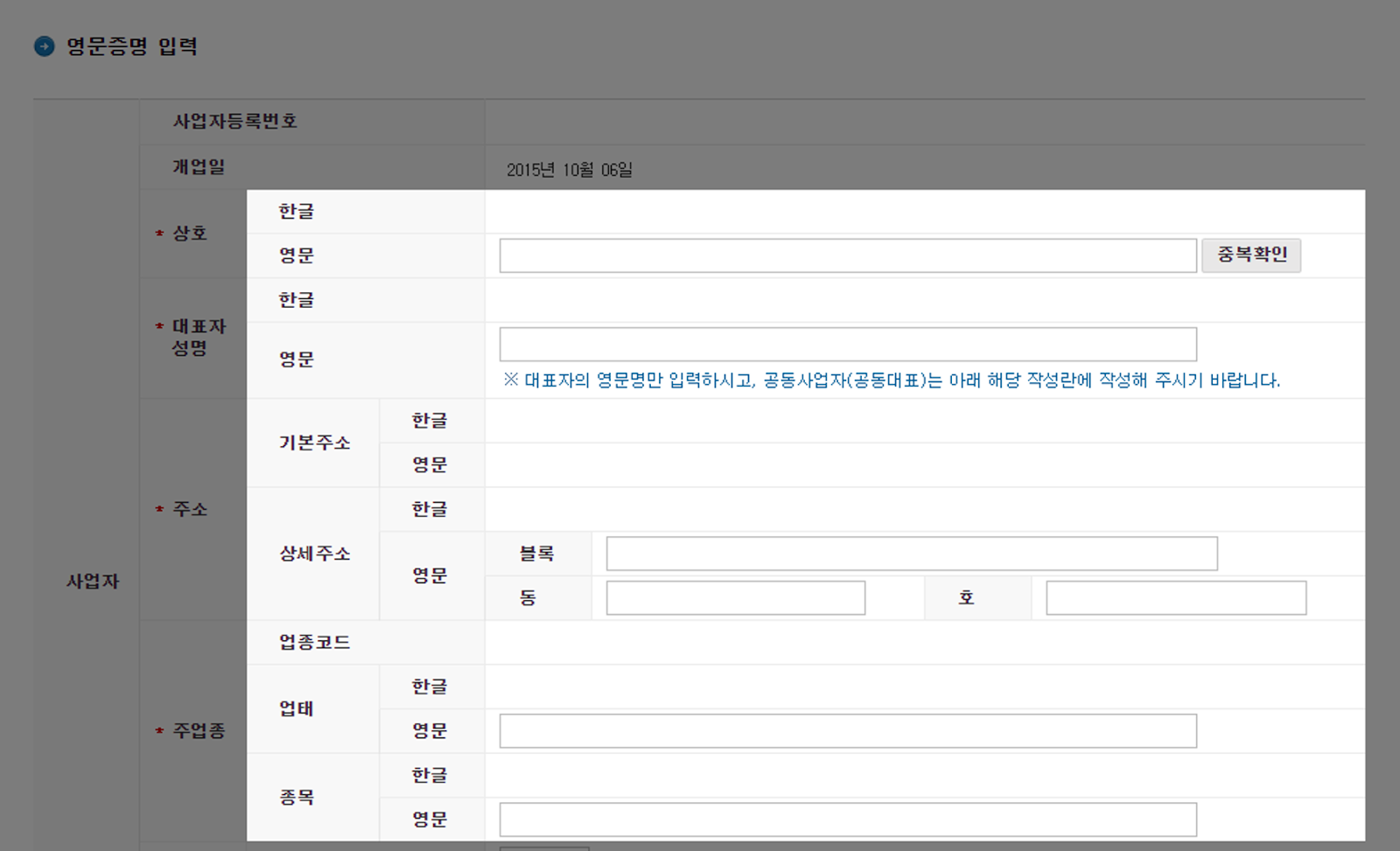 상호, 대표자 성명, 사업장 주소, 주업종을 영문으로 입력 및 확인해주세요.