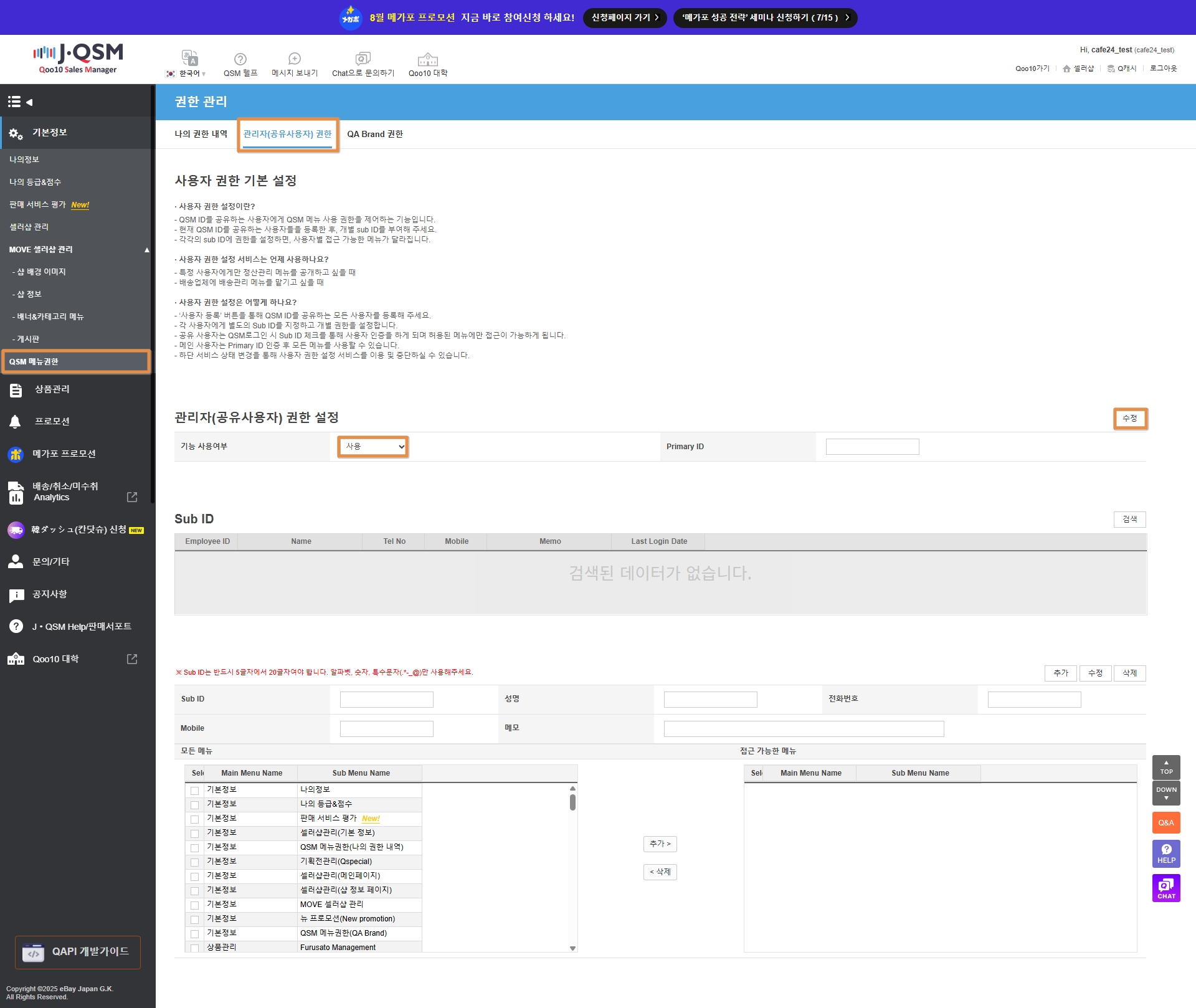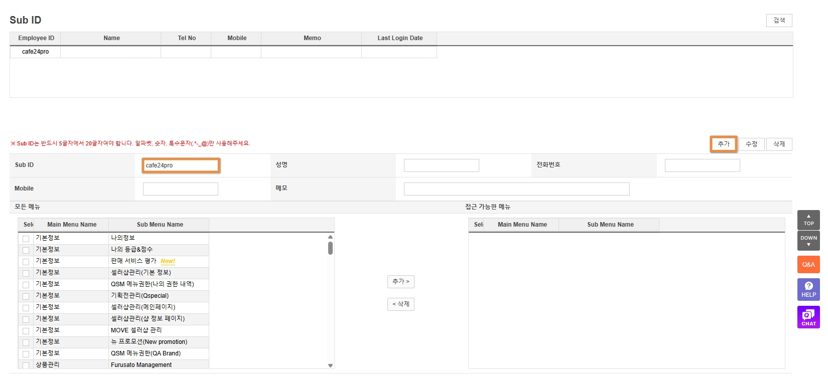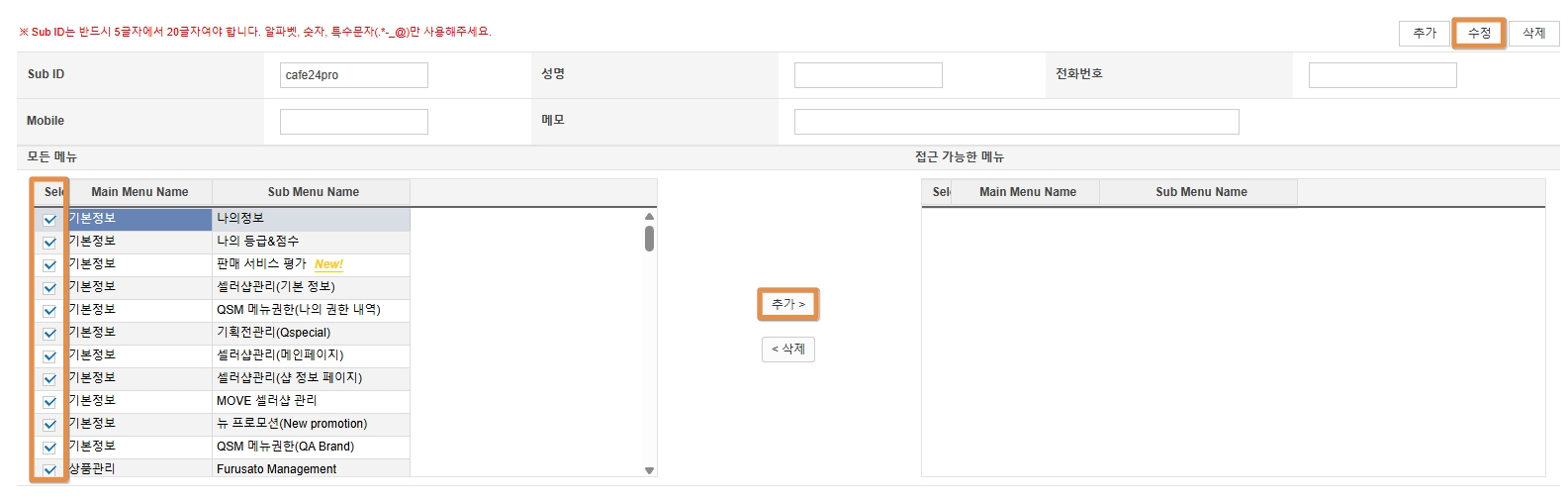 목록에서 Sub ID = cafe24pro를 선택한 뒤, 왼쪽 ‘모든 메뉴’ 영역에서 아래 메뉴를 체크하고 가운데 [추가 >] 버튼을 눌러 오른쪽 ‘접근 가능한 메뉴’ 영역으로 이동시킵니다.