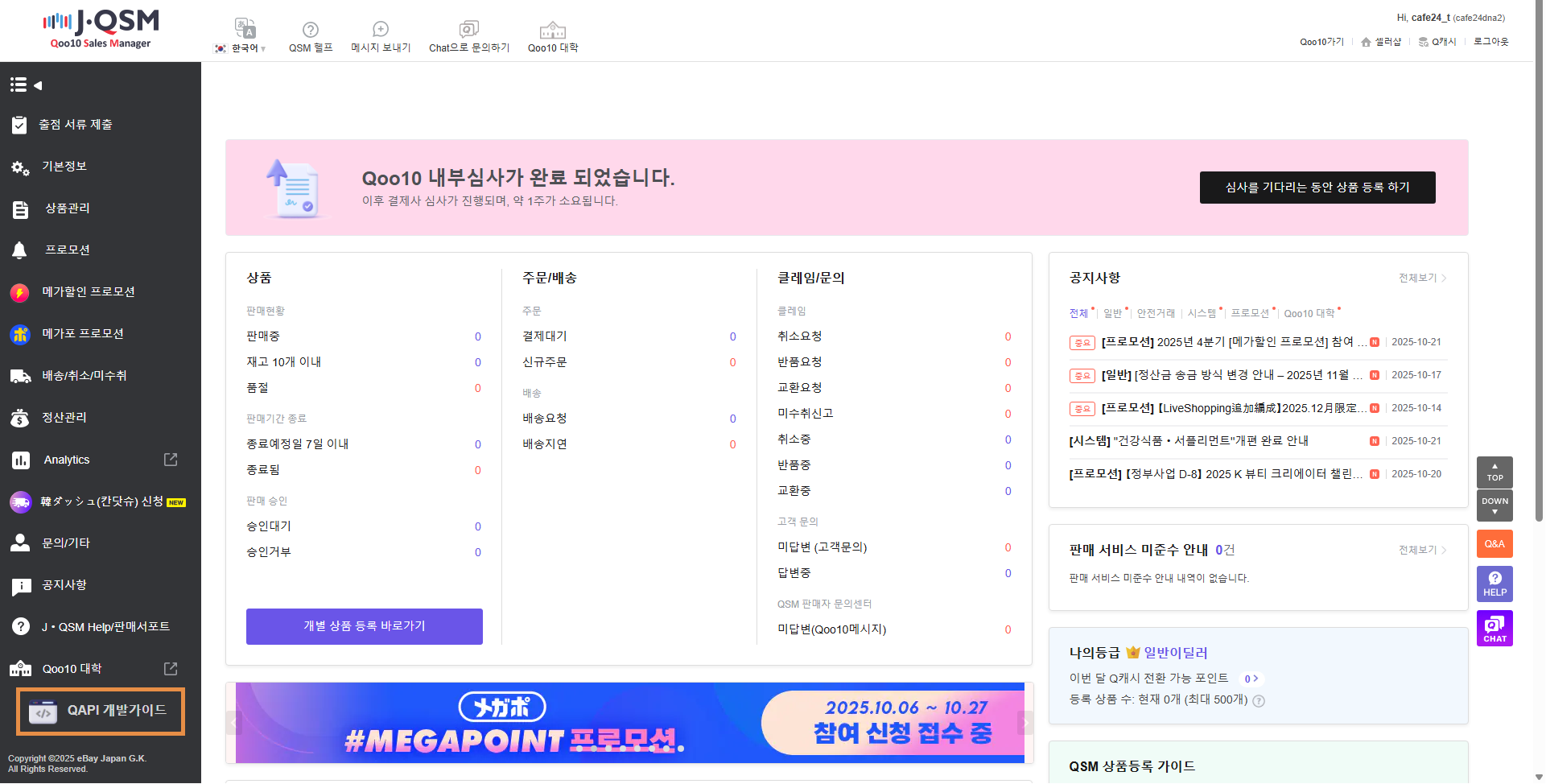 마켓 판매자센터(J·QSM)에 접속하셔서 API Key가 정상적으로 발급되었는지 확인해 주세요.