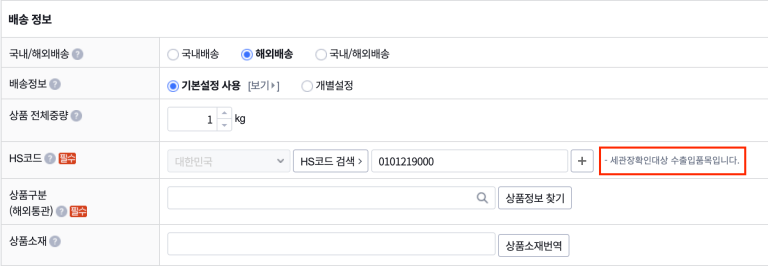 1. '배송정보(탭)'에서 HS코드를 설정할 때, 세관장확인대상 HS코드를 선택하면 안내 문구가 노출되어요.