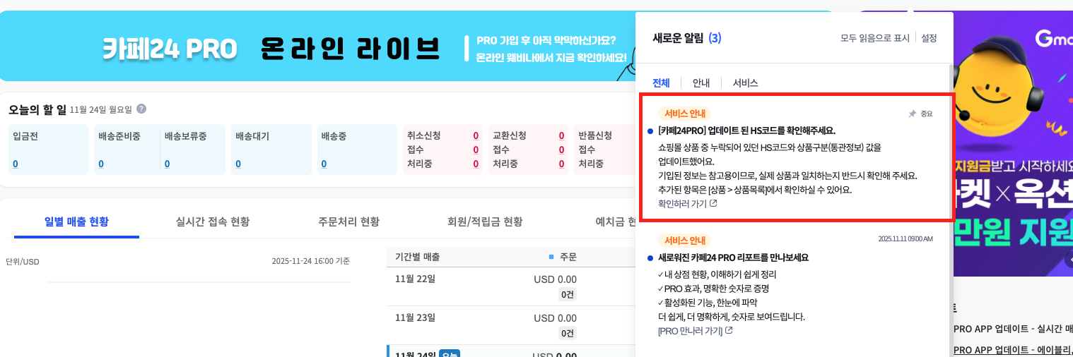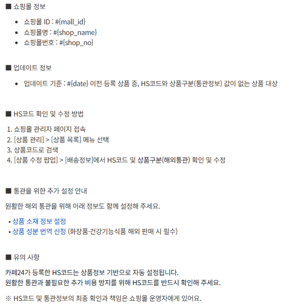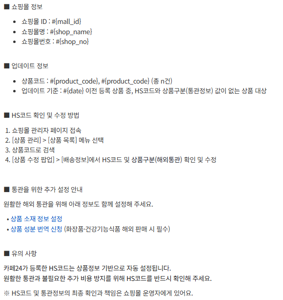 알림을 받으신 후, 반드시 추천 등록된 HS 코드와 통관정보를 확인하고 필요 시 직접 수정해주세요.