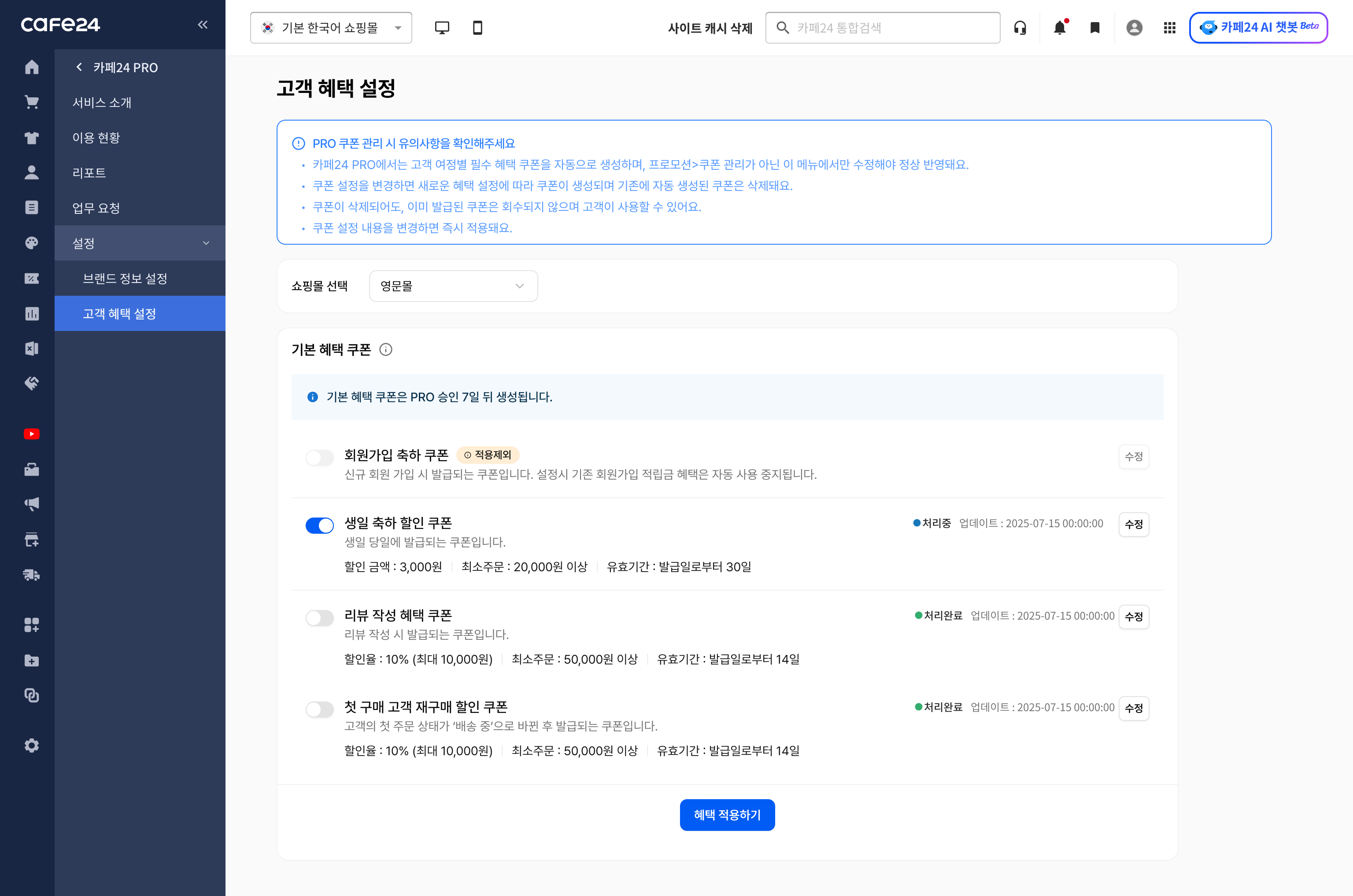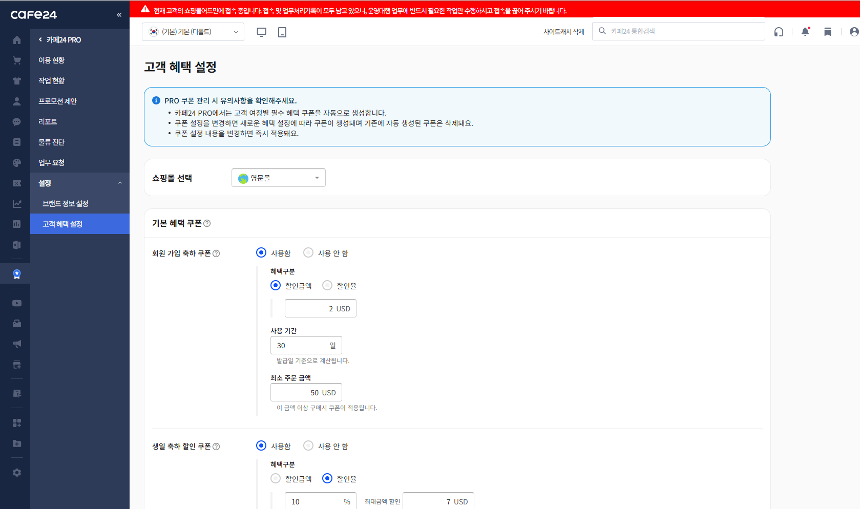 경로 : 카페24 관리자 > 카페24 PRO > 설정 > 고객 혜택 설정 > 쇼핑몰 선택 "영문몰/일문몰"
