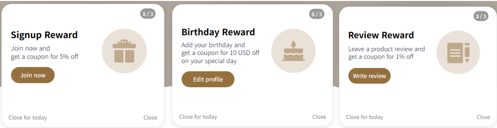 고객은 팝업을 통해 회원가입 쿠폰, 생일 쿠폰, 리뷰 작성 후 쿠폰을 발급받을 수 있습니다.