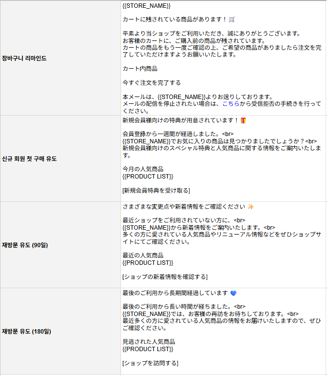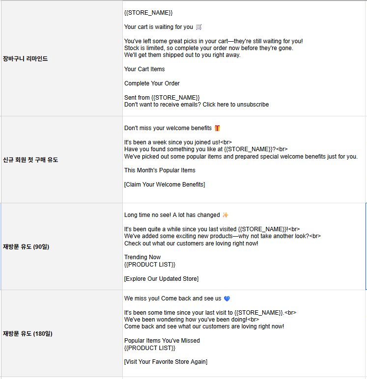 각 상황에 맞는 이메일을 발송하여 고객 재방문율, 구매 전환율을 향상시키고자 합니다.