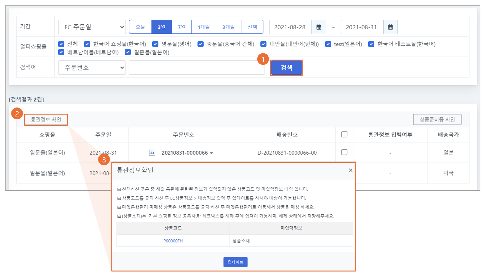 정보 확인 | 주문 선택 → [통관정보 확인] 클릭 |
